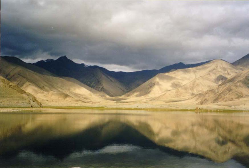 Чатыр-Кель. В воде отражается запорошенный хребет Ат-Баши. На переднем плане