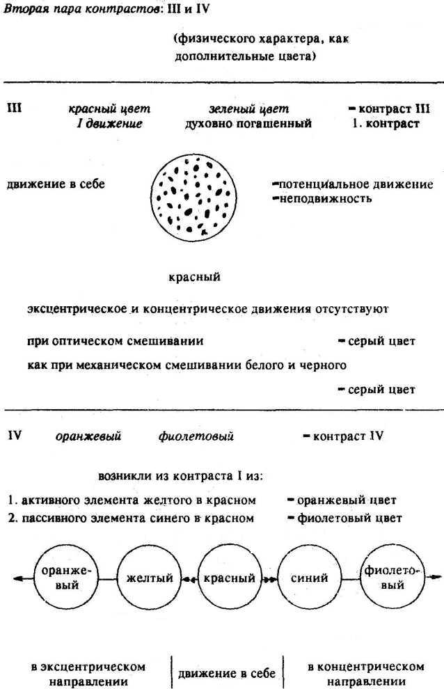 Упомянутая выше попытка Скрябина: усилить действие музыкального тона действием соответствующего цветного тона, является, разумеется, лишь очень элементарной попыткой, лишь одной из возможностей. Кроме созвучия двух или, наконец, трех элементов сценической композиции, может быть использовано еще и следующее: противоположное звучание, чередующееся действие отдельных звучаний, использование полной самостоятельности (конечно, внешней) каждого из отдельных элементов и т. д. Именно это последнее средство уже применял Арнольд Шенберг в своих квартетах. И тут мы видим, как сильно повышается сила и значение внутреннего созвучия, когда внешнее созвучие применяется в этом духе. Представьте себе только преисполненный счастьем новый мир трех мощных элементов, которые будут служить одной творческой цели. Мне приходится здесь отказаться от дальнейшего развития этой значительной темы. Пусть читатель и в данном случае соответствующим образом применит принцип живописи, и перед его ду-