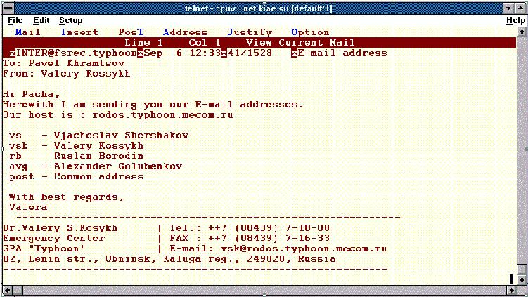 В заключение хотелось бы отметить, что возможности почты не ограничиваются только пересылкой корреспонденции. По почте можно получить доступ ко многим ресурсам Internet, которые имеют почтовых роботов, отвечающих на запросы страждущих. Поэтому имеет смысл более детально изучить программное обеспечение, поддерживающее e-mail. Время, затраченное на чтение документации и опыты, окупятся возможностью получения информации из информационных архивов сети.