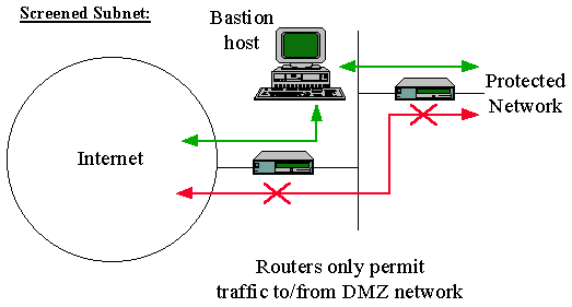 Example Network level firewall: In this example, a network level firewall called a "screened subnet firewall" is represented. In a screened subnet firewall, access to and from a whole network is controlled by means of a router operating at a network level. It is similar to a screened host, except that it is, effectively, a network of screened hosts.
