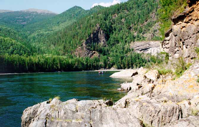 Мы слегка не укладывались в график, и поэтому был назначен ранний (для нас, конечно) подъем. Встали в 8 (как нам казалось, в несусветную рань) и начали собираться. Наше самолюбие было уязвлено проплывавшей мимо группой из двух катов (это называется мы быстро собирались!). С катов спросили откуда мы и собирались проплывать дальше, как тут Митяй узнал в катамаранщиках челябинцев, с которыми мы стояли на Хойто-Голе. Когда Митька представился, с катамаранов раздался крик "Чалка!!!". Всегда приятно встретить знакомых людей (если это хорошие люди). Челябинцы пообщались с нами и, оставив нам в подарок молодой вареной картошки и оладьев, двинули дальше.