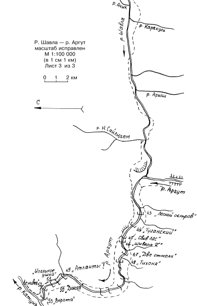 50. Дикая шивера. Начинается примерно через 200 м после пор. Атланты. Название свое вполне оправдывает: беспорядочная мешанина обливных и надводных камней, валов и бочек высотой до 1,0-1,5 м, хаотичных горизонтальных и вертикальных течений. Кончается за правым поворотом.