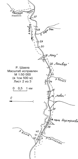 38. Пор. Неустроева***. Сложнейший из ныне проходимых на Шавле. Начинается на левом повороте после плеса; правый берег - скальная стенка. Образован осыпью левого берега, прижавшей реку к скале. Осыпь опасная, живая, тропа проходит вдоль самой кромки воды. После каскада заходных сливов высотой до 1,0 м на повороте следует короткий участок чистой воды, затем большая обливная плита в центре и основной участок - крупноглыбовая горка с суммарным перепадом в несколько метров. По центру каскад сливов до 1,5 м со сложными бочками и котлами. Однако, в отличие от пор. Уйгур и Кечу-1, здесь имеется четко выраженная основная струя. За порогом в расширении русла шивера, в центре отмель, справа гряда обливных камней - естественная страховка-ловушка.