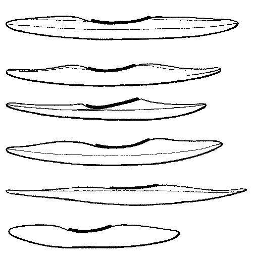 Типичные обводы различных типов каяков, сверху вниз: для