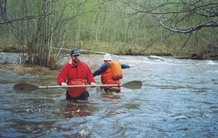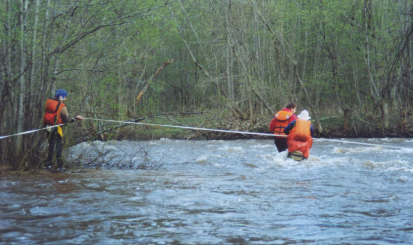 Река в том месте разветвлялась на три рукава, из которых средний был самым проходным. Прямо посреди потока, откровенно и нагло, торчали два валуна, между которыми вполне можно было пройти, что и попытался сделать экипаж "Флагмана". Подвели сгущавшиеся сумерки, усиливавшиеся нависающими над руслом кронами деревьев, и относительно спокойное течение. Невдалеке от этих валунов под водой притаился еще один, который они заметили слишком поздно. Далее все шло по известному сценарию: плотная посадка, безуспешные попытки сняться, медленный разворот лагом, закус борта, затопление лодки и наворачивание оной на подлый обливняк. Было мелкое место вне главной струи, поэтому Адмирал и Димка Яковлев просто вылезли в воду и безуспешно стали снимать дугообразного "Флагмана" с прикола. За этими попытками мы их и застали. К счастью, справа находилась широкая и глубокая заводь в месте впадения правого рукава, а на берегу заводи - роскошная полянка. Спасработы проходили по следующей схеме: одну морковку натянули между правым берегом и островом, образованным центральным и правым рукавами, вторую морковку - между островом и байдаркой. Адмирал разгружал вещи и передавал Яковлеву, который, используя морковку как леер и не без труда преодолевая стремнину, относил вещи на остров. Куликов просто натягивал морковку, пытаясь хотя как-то страховать Яковлева, который, после долгих уговоров, согласился-таки надеть галкин спас. С острова он уже в спокойной воде, но по грудь, транспортировал шмотки на берег, где их брали Галочка с Андрюшей. Она натягивала трос, а Андрюша успевал его обматывать вокруг дерева.