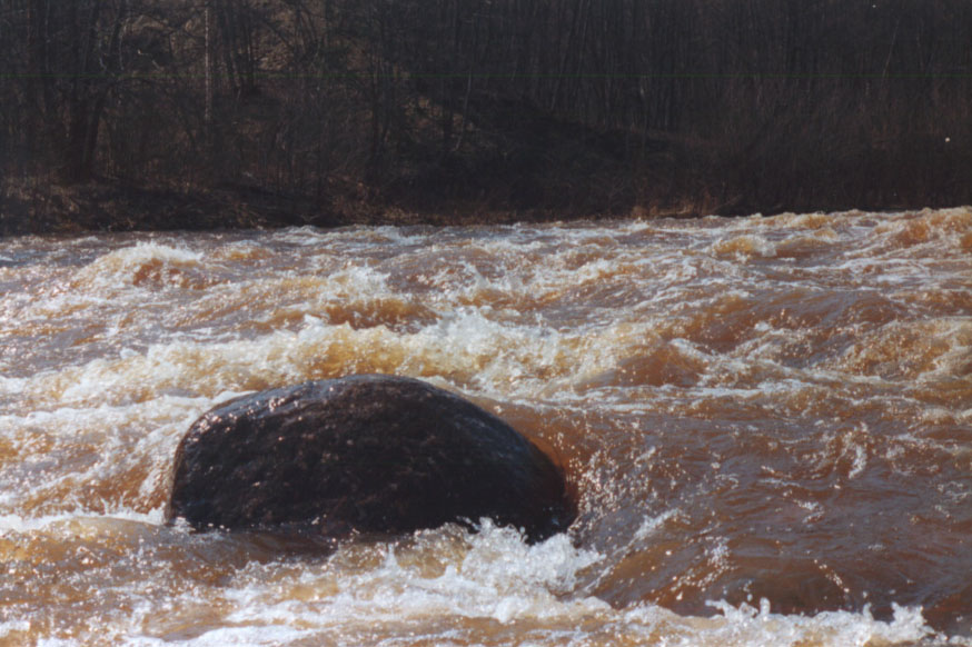 Теперь - пространные личные впечатления. Ни секунды передышки. Напряжение нервов, глаз, рук, голосовых связок. Как о чуде, мечтаешь о блюдце, чтобы просто ткнуться в берег и перевести дух. Удавалось это раза три, не более. "Антон, налево! - ору, стараясь перекрыть рев стихии, - После больших бурунов направо... Резко, резко! Сели... Снялись! Теперь под правый резко! Прижим! Давай! По центру, потом налево!". Ответов Антона (судя по движениям головы, нередко бранных) не слышно совершенно. К счастью, сильное течение спасало, поскольку снимало с камня прежде, чем повернуть поперек струи. Я не матерился - некогда, едва хватало времени, чтобы передать команду, а свое мнение по поводу этой речки высказывал уже про себя. Одно хорошо - нет деревьев в русле, но это с лихвой компенсируется скрытыми камнями.