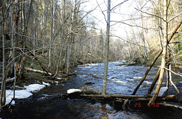 между двумя упавшими деревьями, с траверсом реки между ними. Расстояние