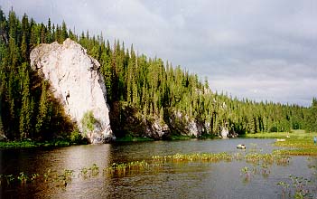 Сам Подчерем - речка очень красивая, и вобщем то для подьема вверх неплохая - по берегам почти всюду каменистые отмели - что-то типа тропы-бечевника (о подьеме на веслах забудьте сразу - и бечевой то в одни руки не всегда байдарку можно вытянуть), однако: по берегам многометровой полосой растут некие местные кувшинки ("лопухи") - течения в них естественно никакого - никаким корабликом на пятнадцать метров байдарку от берега не отведешь, веревка цепляется за лопухи, байдарка зарывается в лопухи, затем тыкается носом в берег - приходится, ныряя чуть не по уши, выводить ее на чистую воду - и так каждые двести метров. На подьем до верховьев Подчерема нужно отводить десять дней минимум (плюс обязательно одна дневка - задалбывает подобное время препровождение ужасно). От типа судов скорость подьма практически не зависит - у нас были ПСН и "Егерь", а паралельно шла группа каких-то уральских ребят на Салютах - шли примерно в одном темпе - то мы их обгоняли, то они нас.