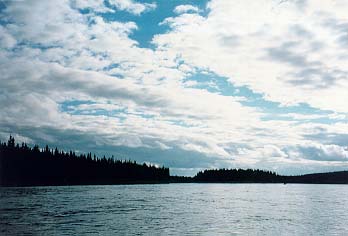 Когда мы прошли избу Летняя, нас догнала и перегнала группа московских байдарочников. Встали в 21.20 на высоком берегу напротив скал. В этом месте оказалось очень неплохое эхо. Вечером Билл долго пытался его перелаять.