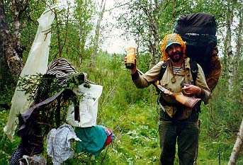 Встали в 16.25 немного дальше ручья. Там большая площадка с высокой травой. Лагерь разбили примерно в 120 м. от берега в березняке. Оборудованное место'. стол, скамейки. Но с дровами сложно. А с гнусом хорошо, благо место не продувается. Последний раз встретились с байдарочниками- они с завистью смотрели на то, что мы уходим с этой реки. Вечером пересчитали продукты и устроили большую обжираловку.