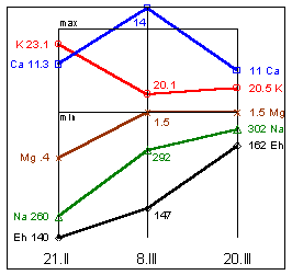 Na=310mg%; K=19,5mg%; Mg=1,9mg%; Ca=12,1mg%; Eh=163мВ.
