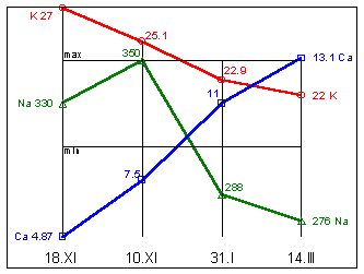 крови: Na=350mg%; K=17,8mg%; Mg=2,8mg%; Ca=12,7mg%; Eh=148мВ.